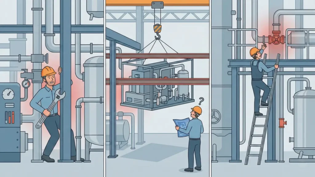 この例では、結局タンクを先に搬入し、手前のラックは重機を使わずに「小型移動式クレーンとチェーンブロックと人力」で組み上げるという、通常の2~3倍の工数と危険を伴う作業を強いられました。