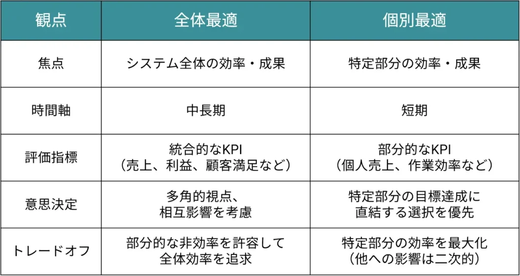 全体最適とは、システム全体の目標達成や成果を最優先する考え方です。