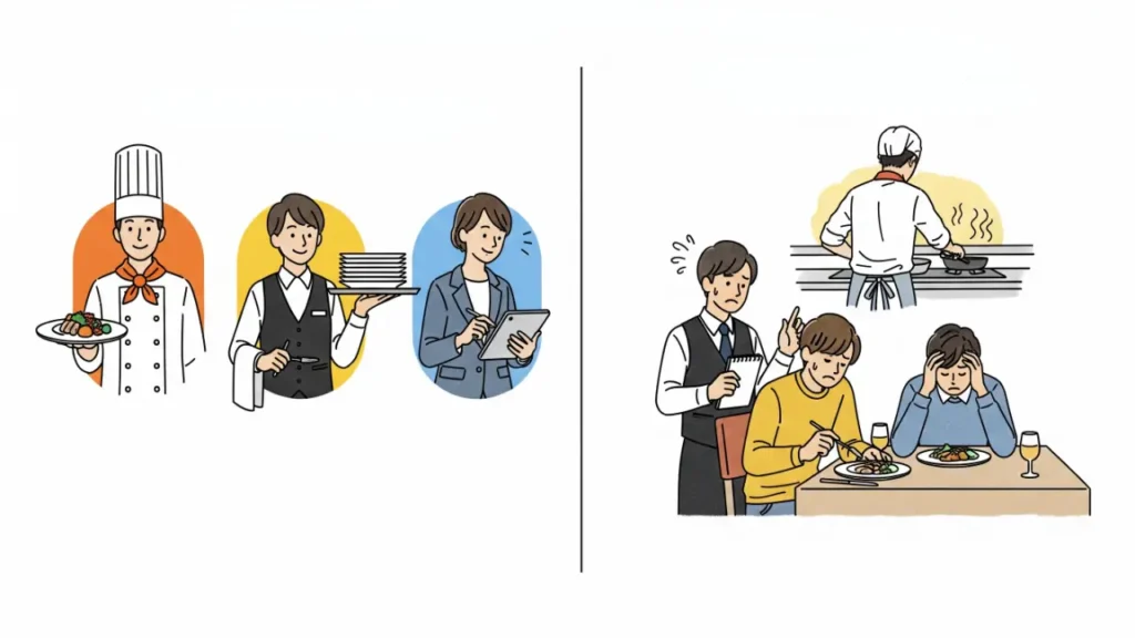 これら「最高の個別最適」が同時進行すると、レストラン全体は深刻な不協和音に陥ります。