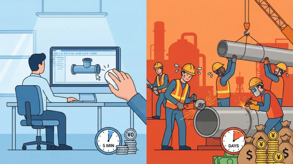設計段階において、「この配管ルートは将来メンテナンススペースが狭くなるから、500mm右にズラそう」と思った場合、作業時間はせいぜい5分で、修正にかかる追加費用は実質0円です。