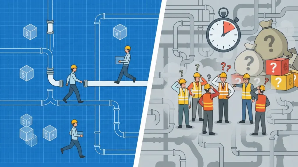 設計段階なら「5分、0円」で済んだはずの修正が、現場では「1日、数十万円」に化ける。 これが、図面無し工事の最大のリスクです。