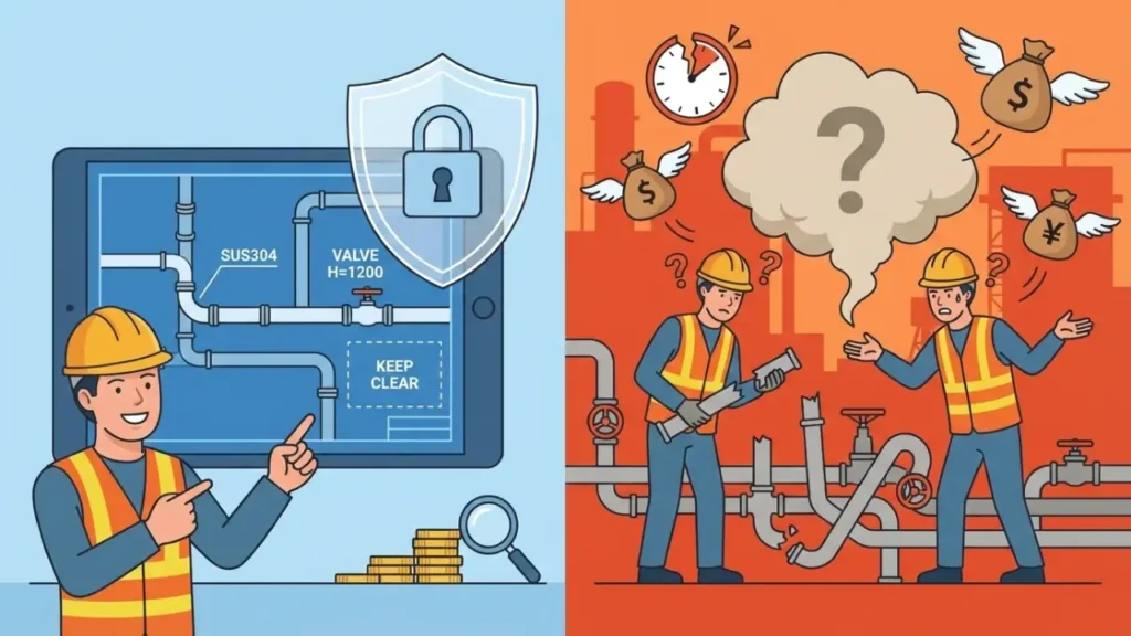 これがあれば、「配管の材質を間違えられた」「必要なバルブが付いていない」「計装機器の接続位置を間違えた」といった、機能上の重大事故を回避できます。